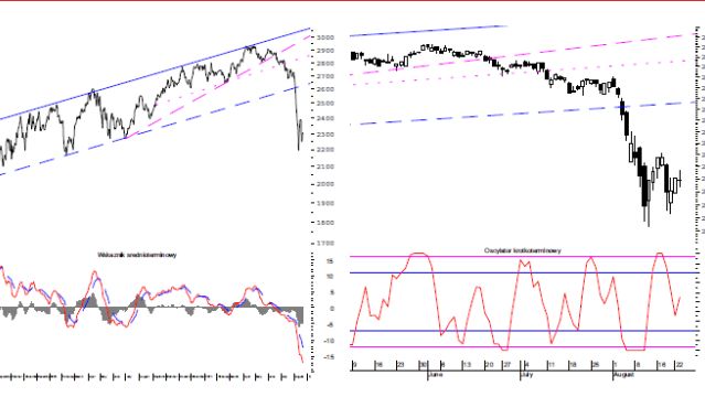 WIG20 kontynuuje korektę. Choć na razie nie pojawiły się sygnały sprzedaży i kolejne sesje mogą przynieść kontynuację wzrostów, to jednak ruch ma charakter korekcyjny i po jego zakończeniu należy oczekiwać testu ostatnich lokalnych minimów w strefie 2115-2195 punktów.