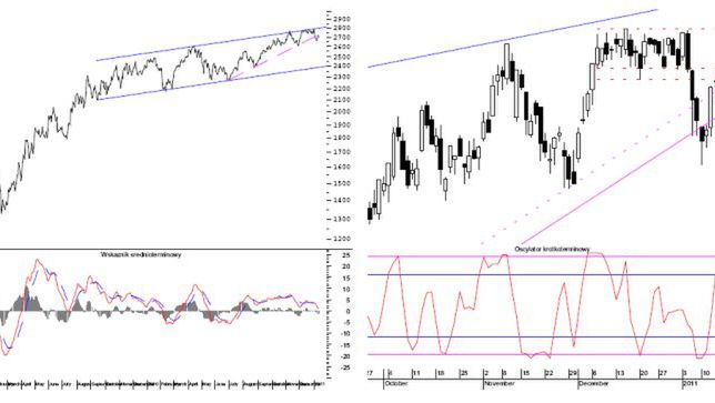 WIG20 lekko w piątek zniżkował. Indeks nadal jednak znajduje się powyżej wsparcia połowy drugiej białej świecy z polowy ubiegłego tygodnia. Tym samym, kontynuacja korekcyjnych wzrostów wydaje się całkiem prawdopodobna. W takim przypadku minimalny zasięg ruchu nalezy określił na 2741 punktów, ale nie można wykluczyć, że indeks powróci w obręb grudniowej konsolidacji.
