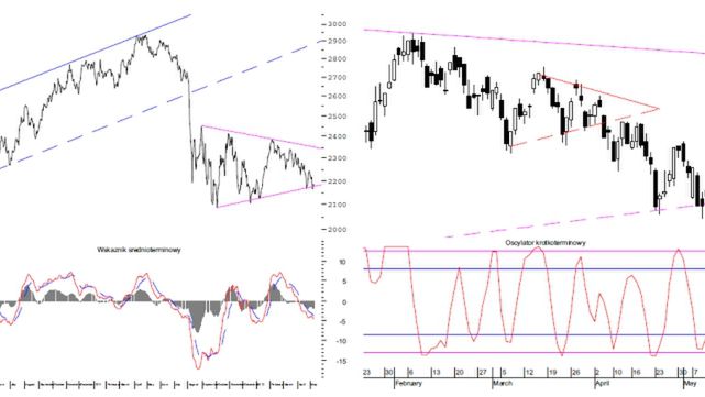 Po spadku na dolne ograniczenie średnioterminowego trójkąta symetrycznego, WIG20 rozpoczął konsolidację. W średnim terminie jednak więcej przemawia za kontynuacją spadków i na najbliższych sesjach należy oczekiwać pojawienia się sygnałów sprzedaży o minimalnym zasięgu na 2135 punktów i potencjalnym na 2010 punktów lub 2065 punktów.