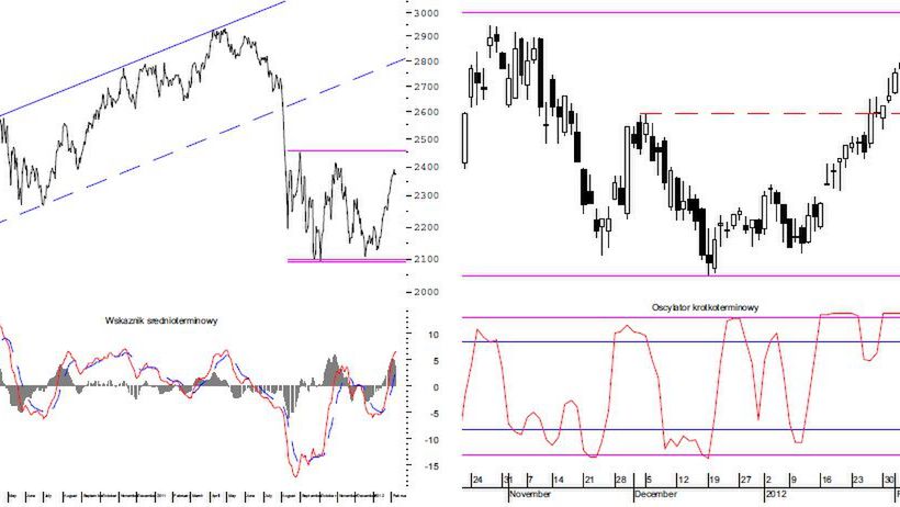 Od tygodnia WIG20 konsoliduje się pod strefą docelowego zasięgu ruchu 2390-2400 punktów, nie generując żadnych sygnałów inwestycyjnych. Dopiero przełamanie wsparcia na poziomie 2358 punktów będzie można interpretować jako sygnał sprzedaży. W przypadku kontynuacji wzrostów, kolejny poziom docelowy stanowi