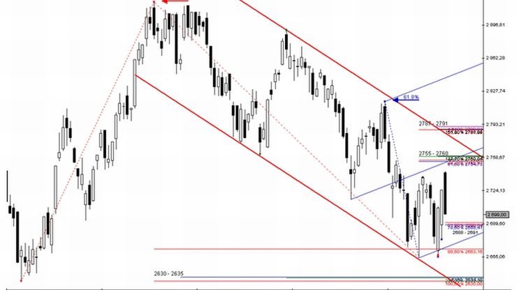 W efekcie już na samym początku poniedziałkowego starcia doszło do naruszenia pułapu cenowego: 2735 pkt wytyczonego na bazie poprzedniego lokalnego szczytu. Z punktu widzenia klasycznej AT otrzymaliśmy zatem pozytywny sygnał techniczny wskazujący na możliwość realizacji potencjału wzrostowego wynikającego z formacji podwójnego dna.