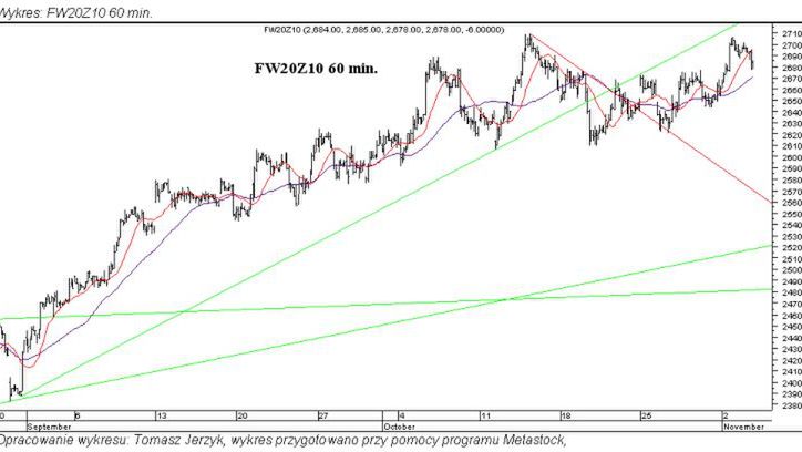 Kontrakt odnotował spadek do 2678, a zamknięcie nastąpiło w rejonie dziennego minimum na 2677. Poziom ten wyznacza istotne wsparcie i jeśli wzrost ma być dalej kontynuowany pułap ten nie powinien zostać.