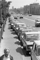 Na zdjęciu: Most Poniatowskiego w Warszawie, a na nim kolejka aut. Samochody prywatne i taksówki czekają kilka godzin na tankowanie benzyny. Zdjęcie z 1983 roku.
