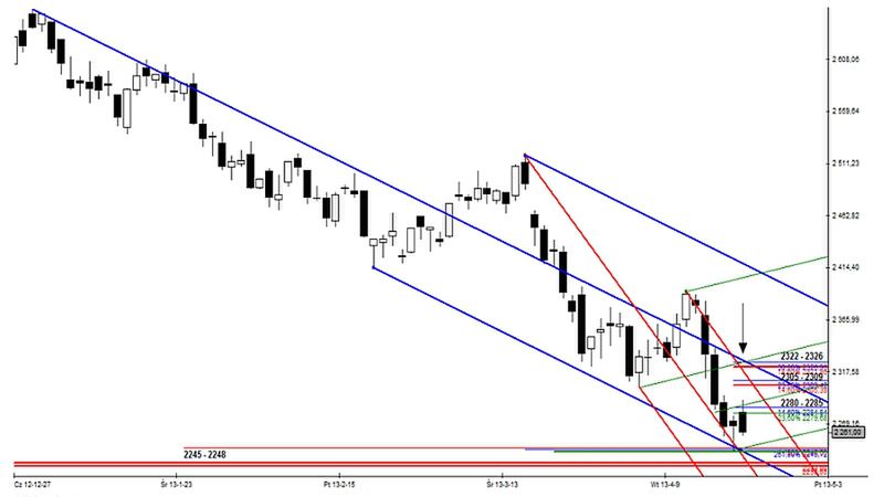 Wydarzeniem technicznym ostatnich sesji była na pewno piątkowa obrona strefy wsparcia: 2245 – 2248 pkt. Po wcześniejszym przełamaniu węzła Fibonacciego: 2277 – 2281 pkt. fala spadkowa przyspieszyła i ostatecznie z dość wyrazistą reakcją popytu mieliśmy do czynienia dopiero we wspomnianym już korytarzu cenowym: 2245 – 2248 pkt.