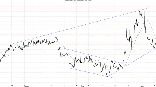 Kurs CHF/PLN, podobnie jak EUR/PLN, w zdecydowany sposób opuścił swój kanał spadkowy, docierając do poziomu 3,4850, po czym dokładnie tak jak wspomniana para odbił się od wielomiesięcznych maksimów i zawrócił. Gdyby ruch w górę był kontynuowany, czego oczywiście nie życzymy kredytobiorcom frankowym, to możemy oglądać podejście powyżej wspomnianego poziomu 3,4850, czyli półrocznych maksimów. W wyniku ostatnich silnych korekt kolejnym wsparciem jest poziom 3,4000.
