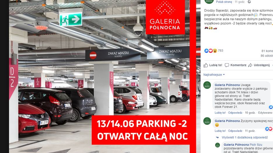 "Drodzy Sąsiedzi, zapowiada się iście sztormowa pogoda w najbliższych godzinach. Przenocujcie bezpiecznie auta na naszym dolnym parkingu, dziś wyjątkowo poziom -2 będzie otwarty całą noc!" - taki komunikat na swoim Facebooku zamieściła w czwartek wieczorem Galeria Północna.