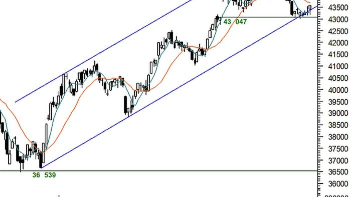 Ostatnia sesja w minionym tygodniu wypadła dobrze dla posiadaczy akcji. Na wykresie indeksu WIG pojawiła się biała świeca z kursem zamknięcia na maksimach dziennych. Dodatkowo kupujący pokonali opór w postaci połowy czarnego korpusu z dnia 23 października, co wstępnie otwiera popytowi drogę do ponownego ataku szczytowego na poziomy 44 617 pkt, gdzie znajdują się maksima z ubiegłego miesiąca. Posiadacze akcji wybronili w piątek także dolną linię kanału wzrostowego, w którym kurs indeksu porusza się od maja. Dodatkowo luka wzrostowa z 14 września broniona jest z determinacją, co wszystko łącznie przemawia za ponownym ruchem wzrostowym. Oscylator siły trendu wskazuje na minimalną przewagę podaży, natomiast RSI i Composite Index sygnalizują krótkoterminową przewagę popytu. Z obrazu zestawu tych indykatorów można odczytać zatem scenariusz przynajmniej ponownego testu maksimów z października, gdyż to wkomponowałoby się w płaską korektę, a taka dopuszczana jest przez wspomniane wskaźniki. W tym tygodniu rynki akcji