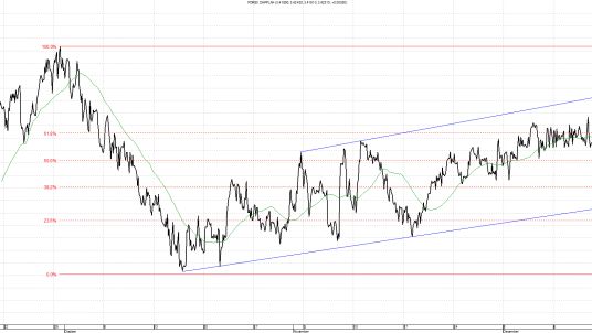 Kurs GBP/PLN przeszedł z silnego trendu wzrostowego w spadkowy. Dla powrotnego ruchu w górę najbliższym oporem jest testowany właśnie poziom 4,9600, czyli górne organicznie wspomnianego kanału spadkowego. Dla ruchu w dół następnym wsparciem jest linia łącząca minima lokalne na poziomie 4,9450 a po jej przebiciu kolejnym wsparciem są minima obecnego ruchu na poziomie 4,9350, czyli ostatnie minima przez dołkiem z przełomu października i listopada.