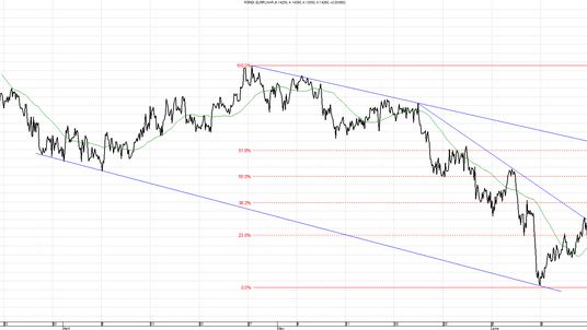 Kurs EUR/PLN utworzył kanał spadkowy, z którego wybiły go weekendowe wydarzenia. W przypadku ruchu powrotnego w górę, ograniczenie formacji znajduje się obecnie w okolicach 4,1500. Kolejny opór znajduje się w okolicach 4,1650, czyli maksimum ostatniego ruchu. Wsparciem są minima lokalne, o które wyznaczyliśmy szerszy kanał spadkowy na 4,0850.