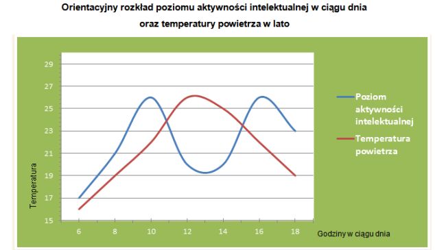 Układając swój plan dnia trzeba wziąć pod uwagę także indywidualne preferencje i skłonności swojego organizmu. To, czy – jak to się popularnie określa – jesteśmy skowronkami, czy sowami. Na aktywność w pracy ma także wpływ pora, o której kładziemy się spać i wstajemy, jaką stosujemy dietę, czy uprawiamy sport. Jednak główny schemat dla większości z nas pozostaje taki sam.