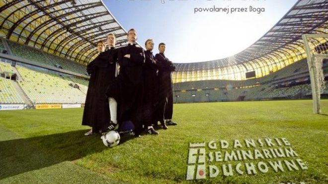 Duchowni ubrani są w sutanny, spod których widać stroje sportowe, przed nimi umieszczona jest piłka nożna. Całość okrasza hasło "Dołącz do kadry powołanej przez Boga. Gdańskie Seminarium Duchowne Czeka".
