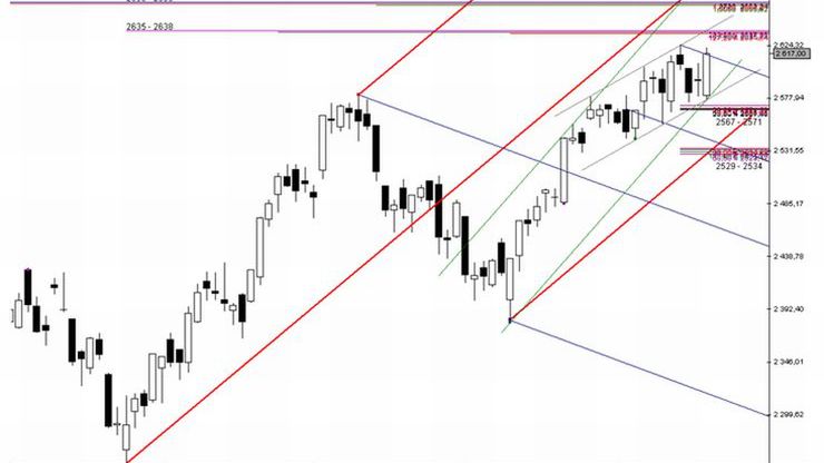 Osobiście dość prawdopodobnym wariantem wydawał mi się test zapory popytowej Fibonacciego: 2567 – 2571 pkt. W porannej fazie handlu doszło bowiem do naruszenia stosunkowo wiarygodnej WLT (wewnętrzna linia trendu), zatem istniało pewne prawdopodobieństwo, że ruch korekcyjny ulegnie pogłębieniu.