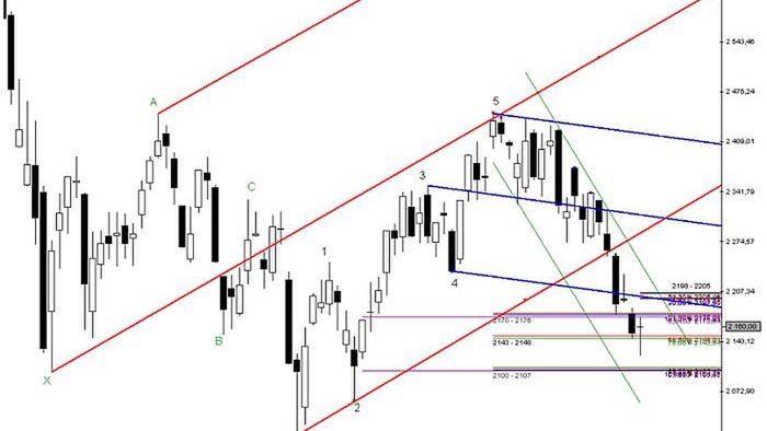 Dużo istotniejszym węzłem cenowym pozostaje jednak w moim odczuciu przedział Fibonacciego: 2198 – 2205 pkt. Z wykresu wynika, że przebiega tutaj także median line. Na tym etapie wydarzeń rynkowych można założyć, iż jego zanegowanie świadczyłoby o silnym wzroście presji popytowej, co w konsekwencji powinno przeobrazić się w kolejną podfalę wzrostową. Niewykluczone, że kontrakty rzeczywiście zdołałyby wówczas wejść w zdecydowanie silniejszą fazę ruchu odreagowującego (w pierwszej kolejności, jeśli chodzi o bariery podażowe, zwróciłbym jednak uwagę na zakres: 2170 – 2176 pkt.).