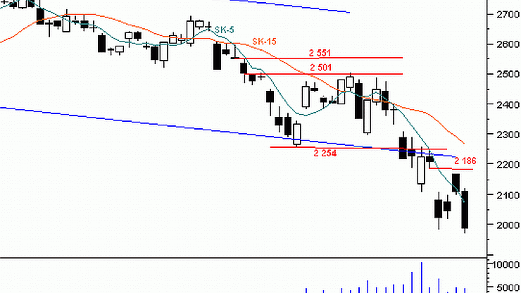 O ile przed rozpoczęciem sesji wczorajszej strona kupująca miała jeszcze jakieś szanse na wzrostowe odbicie, o tyle wczorajsza sesja przekreśliła taką możliwość. Na wykresie kontraktów terminowych pojawiła się wysoka czarna świeca, z niewielkimi cieniami. Relatywnie niewielki dolny cień w odniesieniu do długości korpusu świadczy o tym, że spadki jeszcze się nie zakończyły. Strefa silnego oporu rozciąga się teraz od połowy wczorajszego korpusu (2 046 pkt) do poziomu końca luki bessy z 10.10 (2 186 pkt). W obecnej sytuacji podaż jest zdecydowanie bardziej uprzywilejowana i nie zanosi się na trwałą zmianę. Wskaźniki trendu MACD oraz ADX ciągle sprzyjają stronie sprzedającej. Sam ADX ma jeszcze spory potencjał do wzrostu, sygnalizując tym samym siłę obecnej fali spadkowej. Wskazania Stochastica są obecnie bez znaczenia, gdyż oscylator ten podatny jest na krótkoterminowe ruchy, a ostatnie wahania kursów przyczyniły się do ograniczenia wiarygodności oscylatora. Na wczorajszej sesji LOP zachowywała się w miarę