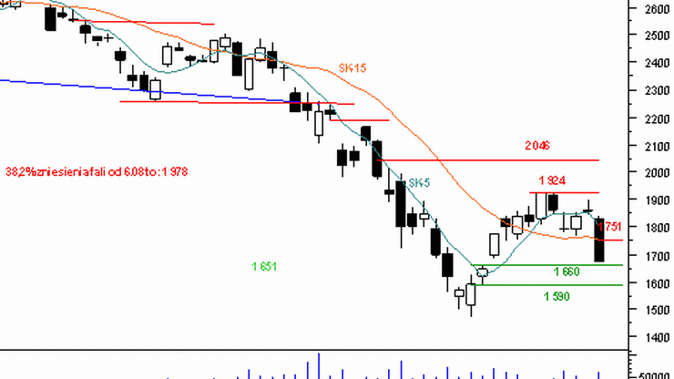 Środowa sesja przebiegła w fatalnych nastrojach. Na wykresie kontraktów terminowych pojawiła się wysoka czarna świeca, poprzedzona luką bessy. Brak dolnego cienia dodatkowo pogarsza techniczny obraz rynku, gdyż minima obecnego ruchu spadkowego nie zostały jeszcze osiągnięte. Strona kupująca oddała bez większej obrony kolejne wsparcia, wynikające z kilkudniowej konsolidacji oraz ze średnich kroczących. Na wczorajszej sesji przecena zatrzymała się w zakresie luki hossy z 29.10, której dolne ograniczenie przebiega na 1 660 pkt. W przypadku zamknięcia luki (przełamania poziomu 1 660 pkt), następny poziom, na którym popyt może próbować bronić kursy to 1 590 pkt, gdzie znajduje się niezamknięta (w cenach zamknięcia) luka hossy z 28.10. W między czasie sprzedający będą musieli pokonać poziom 1 651 pkt, gdzie znajduje się 61,8 proc. zniesienia ostatnich wzrostów. Jeśli w wyniku obecnych manewrów, korekta zatrzyma się powyżej październikowego dołka (1 471 pkt), kupujący będą mieli szansę zaatakować lokalny szczyt na