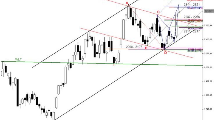 Po wtorkowym przełamaniu strefy oporu: 2247 - 2256 pkt, w której koncentrowały się projekcje wiarygodnej formacji XABCD, kontrakty dotarły wczoraj do obszaru cenowego: 2314 - 2321 pkt. Tak się ciekawie złożyło, że tutaj również wypadają projekcje analogicznej struktury falowej (tym razem zewnętrznej), zbudowanej na bazie współczynnika 1.272 (dodatkowo formację można opisać przy pomocy następujących zależności: 1.618AB = CD, 2.618BC = CD). Osobiście wielokrotnie spotykałem się już z takimi sytuacjami, że po anulowaniu struktury zbudowanej na bazie współczynnika 0.886 (wtorkowa formacja), następował w szybkim tempie test strefy cenowej, gdzie wypadały projekcje kolejnego, tym razem zewnętrznego układu fal XABCD. Warto nadmienić, że podobnie jak w przypadku strefy: 2247 - 2256 pkt, przełamanie przetestowanej wczoraj bariery podażowej: 2314 - 2321 pkt wygenerowałoby następny sygnał kupna. W takim przypadku kontrakty bez problemu powinny osiągnąć pułap cenowy wynikający ze zniesienia zewnętrznego 113% fali