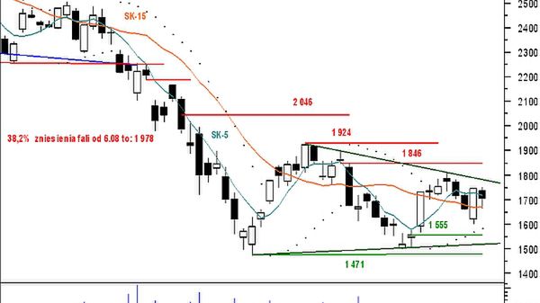 Wczorajsza sesja nie wniosła specjalnych informacji do technicznego obrazu rynku. Kursy kontraktów oscylowały w ramach zmian wtorkowej sesji, a strona sprzedająca próbowała przetestować wsparcie w postaci połowy poprzedniego białego korpusu. Zakres wahań kursów powoli wygasa, gdyż notowania grudniowych kontraktów terminowych ograniczane są przez linię trendu spadkowego, która aktualnie znajduje się na 1 777 pkt i linię wsparcia biegnącą na 1 520 pkt. Obie linie wyznaczają formację trójkąta zwężającego się i jak długo kursy pozostaną wewnątrz tego przedziału, sytuacja będzie korzystna dla traderów. Stronę podaży wspiera Stochastic, który nadal opada, a jego krótkoterminowa negatywna wymowa jeszcze się nie zakończyła. MACD dalej wzrasta, zbliżając się powoli do swojej linii równowagi. Opadający ADX jest potwierdzeniem konsolidacji i wygasania wahań, gdyż informuje o osłabianiu się dominującego wciąż trendu spadkowego.