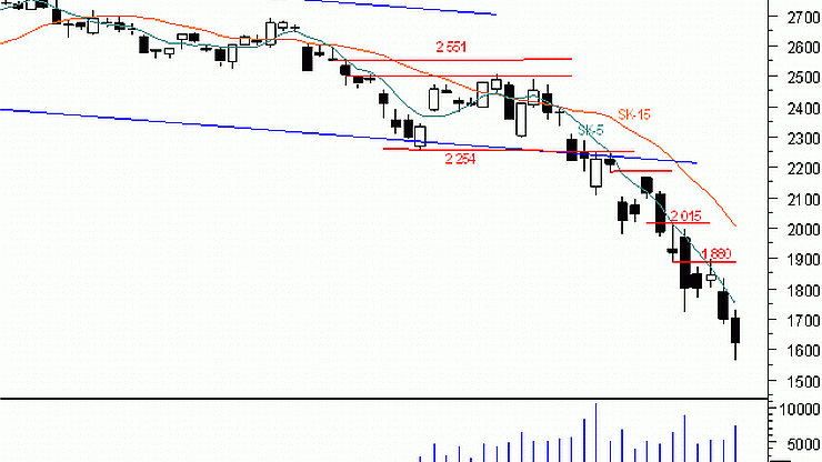 Czwartkowa sesja zakończyła się spadkami. Przez ostatnie dni scenariusz wydarzeń przebiega podobnie. Każde odbicie sprzedający wykorzystują jako okazję do zajęcia krótkich pozycji. Na wykresie kontraktów terminowych pojawiła się czarna świeca z widocznym dolnym cieniem. Poprzednio taka sytuacja przyczyniła się do zatrzymania przeceny na krótki czas. Jak będzie tym razem? – to się okaże. Można jednak zakładać, że wzrosty będą powolne i długotrwałe. Rynek jest obecnie przestraszony, a zmiana długoterminowego nastawienia wymaga czasu. Obecnie trajektoria spadków wyznaczana jest przez średnią SK-5. Ewentualne przełamanie tego ruchomego oporu będzie być może sygnalizować poprawę sytuacji. Wskaźniki techniczne trendu są jednomyślne. Zarówno MACD jak ADX nadal wskazują przewagę sprzedających. Stronę kupującą powinien martwić fakt, że ADX ma cały czas spory potencjał, do wskazania dalszych spadków. We wczorajszym komentarzu odniosłem się do WIG20, który na poziomie 1 676 pkt. posiadał ostatnie wsparcie (76,4 proc.