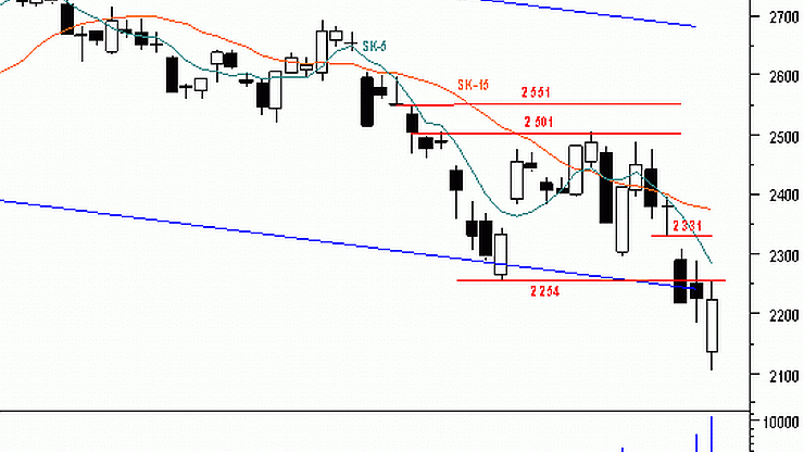 Po wczorajszej sesji sytuacja techniczna odmieniła się nieco. Na wykresie kontraktów terminowych pojawiła się wysoka biała świeca, z widocznymi cieniami. Górnym cieniem strona kupująca testowała poziom przełamanego minimum z 19.09 na poziomie 2 254 pkt. Pretekstem do tak dobrych nastrojów było ogłoszenie przez banki centralne informacji o jednoczesnym obniżeniu stóp procentowych. Aktualne wsparcia wypadają w rejonie połowy wczorajszego korpusu (2 180 pkt) oraz wczorajszego minimum (2 106 pkt). Jak długo notowania kontraktów utrzymają się powyżej tych rejonów, strona kupująca będzie mogła myśleć o wyprowadzeniu korekty. Za takim scenariuszem przemawia także wolumen obrotu, który na wczorajszej sesji był jeszcze większy niż poprzednio i wynosił prawie 105 tys. sztuk. Jeśli chodzi o wskaźniki techniczne, to one jeszcze nie zareagowały, gdyż po emocjonujących manewrach zamknięcie wypadło na poziomie poprzedniego zamknięcia. Jeżeli strona kupująca zdecyduje się na stanowcze działania i pokona opór na 2 254 pkt,