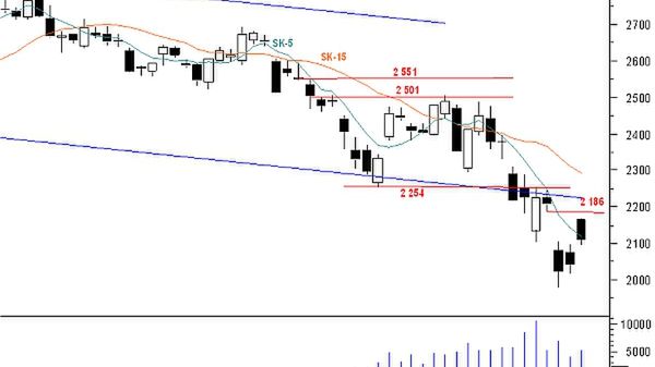 Wczorajsza sesja, podobnie jak poprzednia zakończyła się wzrostami, ale w stylu ponownie czarnej świecy. Po wysokim otwarciu (2 165 pkt), będącym reakcją na zamknięcie rynków amerykańskich i azjatyckich, notowania kontraktów systematycznie obsuwały się. Strona sprzedająca domknęła (cieniami) poranną lukę hossy, ale kupujący wykazali się determinacją i nie dopuścili do osiągnięcia przez kursy poziomu poniżej 2 096 pkt, wyznaczającego początek wspomnianej luki. Najbliższą barierą dla strony popytu jest poziom 2 186 pkt, gdzie znajduje się koniec luki bessy z 10.10. Ewentualny test tego poziomu wykaże intencje kupujących. Po wczorajszej sesji na wykresie kontraktów pojawiła się formacja wyspy odwrotu, która staje się argumentem popytu. Z drugiej strony notowania nadal poruszają się poniżej przełamanej linii trendu spadkowego, biegnącej aktualnie na 2 227 pkt. Tak więc obie strony rynkowe mają teraz konkretne argumenty po swojej stronie, chociaż wydaje się, że strona sprzedająca ma silniejsze. Obserwując