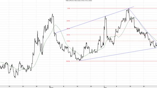 Kurs CHF/PLN, podobnie jak EUR/PLN, osiągał swoje maksima podczas niepokojów na Krymie oraz wcześniejsze w sprawie luzowania ilościowego. Jak widać, frank jest walutą, do której inwestorzy uciekają silniej w trakcie zagrożeń konfliktami militarnymi niż niepokojów na rynkach walutowych. Obecnie przebił on górne ograniczenie trendu spadkowego i porusza się wzdłuż nowo wyrysowanej linii wzrostowej. Kolejne wsparcie znajduje się na 3,4150. Gdyby ruch ten był kontynuowany, co z pewnością nie zmartwi kredytobiorców frankowych, możemy spodziewać się kolejnego przystanku na 3,4050 lub nawet 3,3850.