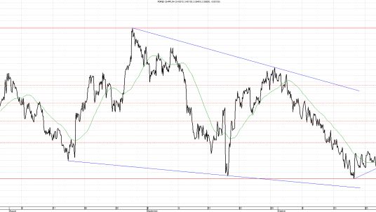 Kurs USD/PLN porusza się obecnie w wąskim średnioterminowym trendzie spadkowym. Wsparciem są obecnie okolice testowanego poziomu 3,0200. W przypadku przebicia oporu będącego górnym ograniczeniem formacji na poziomie 3,0750, nowym oporem będzie poziom 3,1000, czyli ostatnie maksima lokalne. GBP/PLN