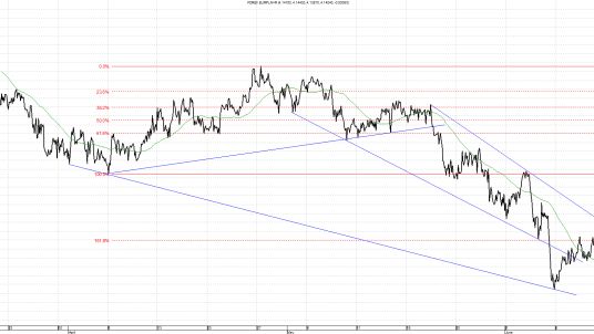 Kurs EUR/PLN utworzył kanał spadkowy, z którego wybiły go weekendowe wydarzenia. W przypadku ruchu powrotnego w górę, ograniczenie formacji znajduje się obecnie w okolicach 4,1500. Kolejny opór znajduje się w okolicach 4,2150, czyli maksimum ostatniego ruchu. Kurs poruszał się w dół na fali przewidywanych obniżek stóp w strefie euro. Po samej obniżce ruch ten był kontynuowany, a kurs łamał kolejne ważne technicznie poziomy. Obecnie wsparciem są minima lokalne, o które wyznaczyliśmy szerszy kanał spadkowy na 4,0850.