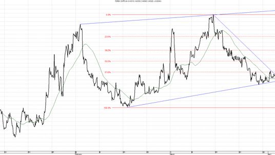 Kurs CHF/PLN, podobnie jak EUR/PLN, osiągał swoje maksima podczas niepokojów na Krymie oraz wcześniejsze w sprawie luzowania ilościowego. Jak widać, frank jest walutą, do której inwestorzy uciekają silniej w trakcie zagrożeń konfliktami militarnymi niż niepokojów na rynkach walutowych. Obecnie przebił on górne ograniczenie trendu spadkowego, chwilę poruszał się wzdłuż nowo wyrysowanej linii wzrostowej a następnie znów ku uciesze kredytobiorców frankowych skierował się w dół. Kolejne wsparcie znajduje się na 3,4100. Gdyby ruch ten był kontynuowany, co z pewnością nie zmartwi kredytobiorców frankowych, możemy spodziewać się kolejnego przystanku na 3,4000 lub nawet 3,3850.