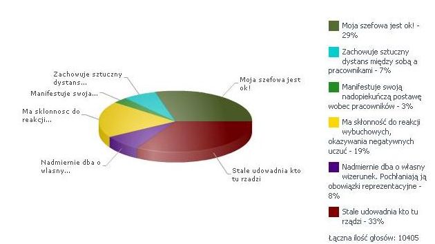 "Moja szefowa jest ok" i "Stale udawania kto tu rządzi" to najbardziej ścierające się opinie na temat naszych przełożonych. 33% głosujących stwierdziło, że niestety ich pracodawczyni ma skłonności do przypominania kto tu jest szefem. Nieco mniej, 29% osób głosowało za tym, że ich szefowa jest w porządku. Pozostałe odpowiedzi nie były już tak bardzo popularne wśród internautów.