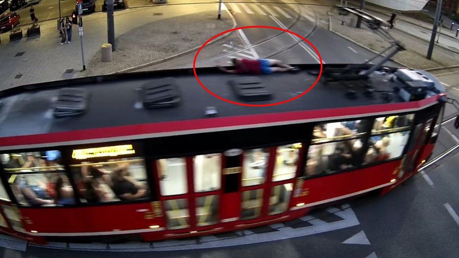 W piątek w mediach społecznościowych pojawiło się nagranie, na którym widać, jak człowiek leży na dachu poruszającego się tramwaju.
