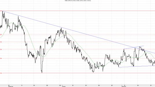 Kurs GBP/PLN utworzył stromy trend wzrostowy, jednakże po odrobieniu spadków z października przeszedł ponownie w trend spadkowy z którego ponownie doszło do wybicia wczoraj. Dla dalszego ruchu w górę najbliższym oporem jest poziom 5,0400, czyli maksima ostatniego ruchu. Dla ruchu w dół następnym wsparciem są już kilkukrotnie testowane okolice 4,9700, czyli poziom, od którego odbił się obecny ruch.
