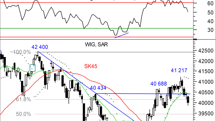 Środowa sesja należała do niedźwiedzi i co warto podkreślić spadki wygenerowane zostały przy zwiększonych obrotach, sięgających po sesji 798 mln zł. Choć zakres ruchu nie był znaczący, to podaży udało się sprowadzić notowania indeksu poniżej obszaru wsparcia na 40 100 pkt, gdzie przebiega 61,8% zniesienia Fibonacciego fali spadkowej z drugiego kwartału. Na wykresie dziennym powstała niewielka, czarna świeca poprzedzona luką bessy, która w najbliższym czasie stanowić będzie barierę dla popytu.
