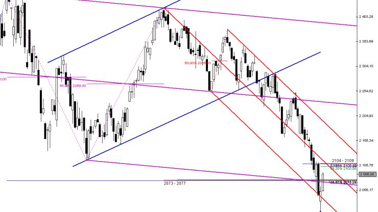 Po wyłamaniu strefa: 2073 – 2077 pkt. zaczęła pełnić na wykresie rolę wsparcia, co generalnie należało traktować pozytywnie – jako zapowiedź kontynuacji korekty technicznej. Niewielka aktywności inwestorów na rynku kasowym była tutaj na pewno czynnikiem obniżającym wiarygodność tej inicjatywy. Ponadto niestabilny Euroland wybijał z rytmu nasz rodzimy, i tak wyraźnie osłabiony i mało zdecydowany popyt. Kolejne fazy handlu nie przynosiły zatem rozstrzygnięcia w kwestii kontynuacji piątkowej inicjatyw byków.