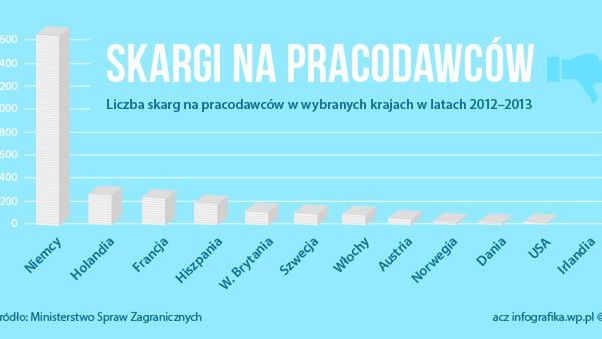 Zdecydowanie najwięcej zażaleń na pracodawców składają Polacy w Niemczech. W 2012 r. odnotowano 1100 takich przypadków, a do końca czerwca 2013 r. doszło kolejne 600. Pracownicy zgłaszają przede wszystkim problemy z uzyskaniem wynagrodzenia. Nie jest ono wypłacane w ogóle lub też w kwocie niższej niż było umówione.