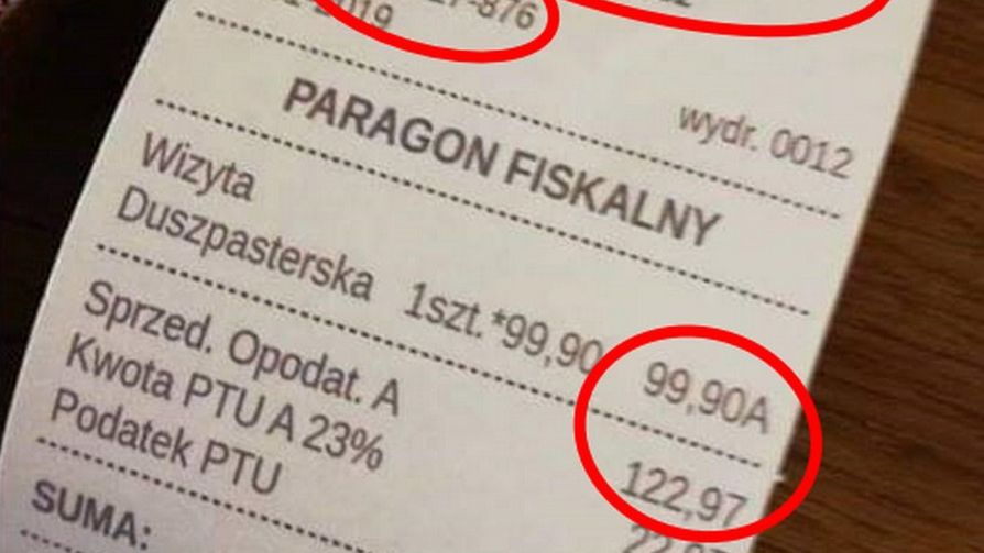 Oprócz wizerunku krzyża, można też na nim zobaczyć numer nieprawdziwy NIP parafii. Fałszywy paragon dotyczy usługi, która została na nim opisana jako "Wizyta Duszpasterska 1 szt.". Cena: 99,90 zł, a razem z 23-procentowym podatkiem VAT w sumie 122,97 zł.