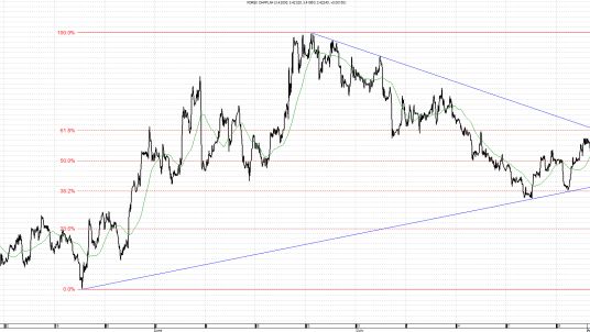 Kurs GBP/PLN znajduje się obecnie w okolicach górnego ograniczenia trójkąta spadkowego. Wsparciem jest poziom 4,8430, czyli minimum z ostatnich dni. Natomiast opór umiejscowiony jest w okolicach 4,8800, gdzie znajduje się górne ograniczenie trójkąta spadkowego.
