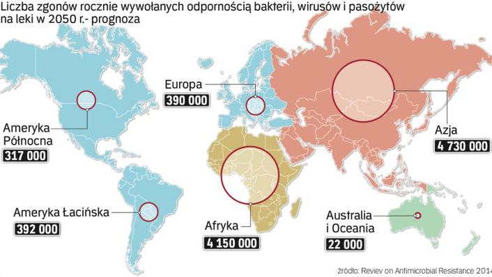 Liczba zgonów z powodu infekcji - takich, które dziś uważamy za pokonane - wzrośnie ponaddziesięciokrotnie - do 10 milionów. Koszty z tym związane sięgną do 2050 roku... 100 bilionów dolarów.