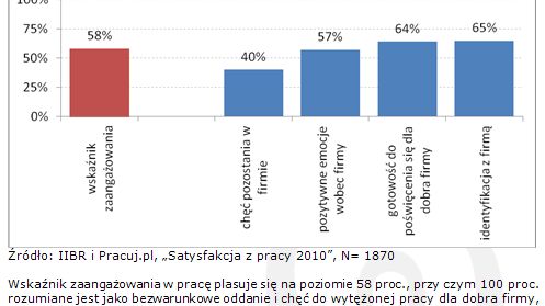 Wskaźnik zaangażowania w pracę plasuje się na poziomie 58 proc., przy czym 100 proc. rozumiane jest jako bezwarunkowe oddanie i chęć do wytężonej pracy dla dobra firmy, a 0 proc. jako gotowość do odejścia z miejsca zatrudnienia przy choćby najmniejszych oczekiwaniach zwiększenia wysiłku wkładanego w pracę. Bardziej szczegółowa analiza pozwala na dostrzeżenie zależności pomiędzy zaangażowaniem w pracę a związaniem emocjonalnym pracownika z miejscem pracy. O ile aspekty zaangażowania związane z identyfikacją z firmą oraz gotowością do poświęcenia się dla jej dobra są podzielane dość powszechnie, to związek emocjonalny oraz – w szczególności – gotowość do dalszej pracy w firmie notują dość niskie wartości. W praktyce oznacza to, że pracodawca nie powinien spoczywać na laurach, gdy widzi duże zaangażowanie załogi w pracę. Dobra oferta od konkurencji potrafi przekonać najbardziej pracowite osoby w firmie do zmiany miejsca pracy.