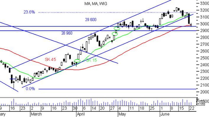 dywergencji hossy, wygenerowane końcem maja przez parę wskaźników RSI i Composite Index. Analizując wykres dzienny WIG należy zwrócić uwagę na szybkie zbliżanie się kursu w dolne okolice konsolidacji majowej. Ten poziom w najbliższym czasie będzie dość kluczowym. Wybicie indeksu dołem poniżej 28 960 pkt stanie się czynnikiem motywującym podaż do większej przeceny.