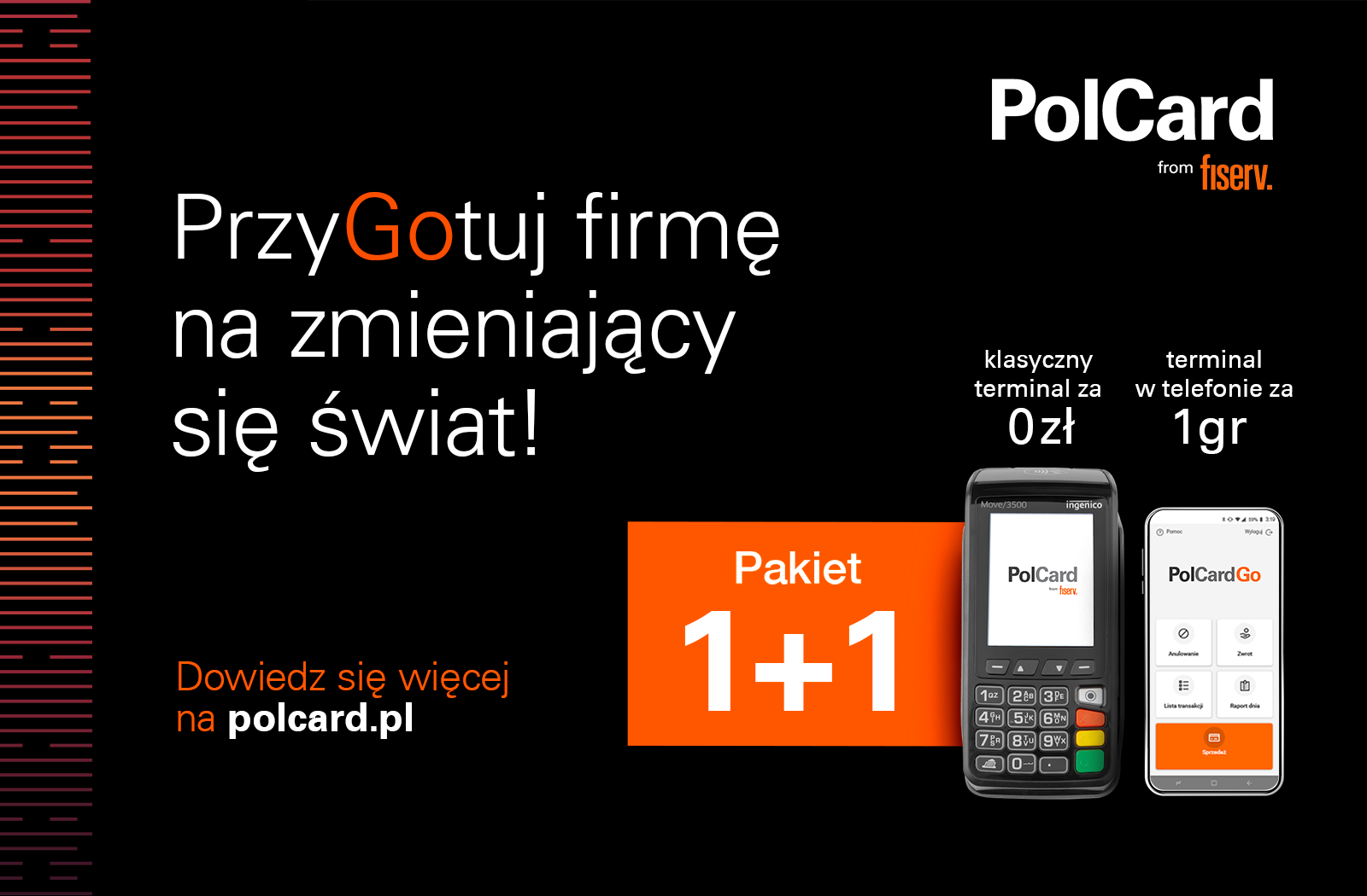 W dynamicznie zmieniającej się rzeczywistości przedsiębiorcy potrzebują odpowiednich narzędzi, aby spełnić oczekiwania konsumentów oraz wyprzedzać konkurencję. Kampania "PrzyGotuj firmę na zmieniający się świat" prowadzona przez PolCard from Fiserv wspiera przedsiębiorców we wprowadzeniu do swoich biznesów innowacyjnych usług i rozwiązań do obsługi płatności. Pozwalają one wyróżnić się na rynku i spełnić oczekiwania klientów, którzy dziś nie rozstają się ze smartfonami, zegarkami czy opaskami, wykorzystywanymi do regulowania nawet drobnych rachunków. W ramach współpracy z PolCard from Fiserv przedsiębiorca może m.in. zainstalować w swojej firmie terminal i aplikację płatniczą. Ponadto ma zapewnione bieżące wsparcie eksperta, opiekę techniczną oraz dostęp do platformy rozliczeniowej OnePortal24, która pozwala na śledzenie wszystkich transakcji bezgotówkowych w czasie rzeczywistym.