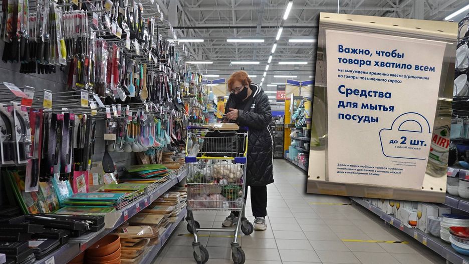Dlatego wprowadza reglamentację takich produktów, jak płatki zbożowe, herbata, kawa, cukier, mąka, dania instant, przyprawy, sosy, konserwy mięsne i rybne, oleje, kosmetyki, proszki do prania, papier toaletowy, chemia gospodarcza, produkty dla dzieci i pieluchy. Na zamieszczonym na Twitterze zdjęciu widzimy ogłoszenie z jednego ze sklepów Lenta z informacją, że można wziąć jedynie dwie sztuki płynu do mycia naczyń.