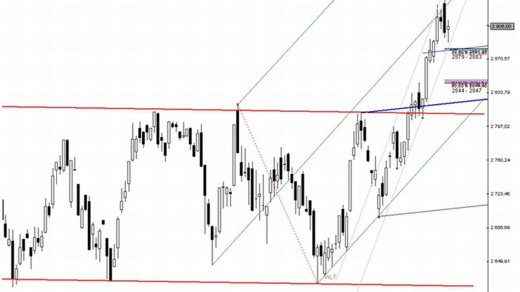 Pozytywnie należałoby się natomiast odnieść do jedynie krótkotrwałego naruszenia 2879 – 2883 pkt. Jak wiadomo w silnych trendach wzrostowych (a z takim mamy na razie do czynienia) niedźwiedzie mają zazwyczaj spore problemy z inicjowaniem stabilnych ruchów kontrujących i w związku z tym często dochodzi do naruszeń potencjalnie istotnych zapór popytowych Fibonacciego. Tego typu sytuacje traktuje się zazwyczaj jako oznakę siły rynku. Niemniej jednak zamknąłbym przynajmniej część długich pozycji z chwilą naruszenia poziomu 2879 pkt. Day-traderzy, choć jest to bardzo ryzykowana strategia, mogliby także rozważyć wówczas otwarcie niewielkiej ilości krótkich pozycji.