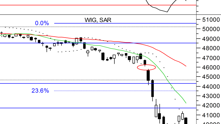 Pomimo usilnych starań popytu z ostatnich dni, wyższe poziomy kursu indeksów stały się tylko pretekstem do kolejnej fali wyprzedaży. Inwestorzy skorzystali z okazji i zrealizowali niespełna tygodniowe zyski, ale nerwowa wyprzedaż rozlała się na cały rynek. W mgnieniu oka indeks szerokiego rynku przetestował wsparcie na 39 000 pkt i z łatwością go przełamał. Zamkniecie wypadło na 38 698 pkt, sprowadzając indeks 5,9% poniżej odniesienia. Ukształtowana w obrazie graficznym świeca nie pozostawiła złudzeń co do dominacji podaży na rynku. Długi, czarny korpus przykrył trzy poprzednie świece, a także domknął lukę hossy z wtorku. Dynamiczny spadek nie pozostał bez echa również w układzie wskaźnikowym. RSI zawrócił na południe przecinając linię sygnalną na 32 pkt, co sugeruje możliwość dalszego osłabienia indeksu. Niestety, spadek potwierdził również ADX, który zanotował najwyższy od 2008 r. poziom 54 pkt. Wczorajsza wyprzedaż nie wróży dobrze dzisiejszym notowaniom. Najbliższe wsparcie umiejscowione jest w okolicach