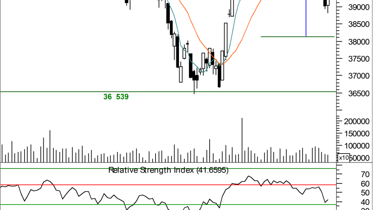 Pełny zakres potencjalnych spadków wynikających z formacji głowy i ramion jeszcze nie został wykonany. Kurs indeksu powinien dotrzeć w okolice 38 240 pkt. Ciekawie wygląda sytuacja na RSI, który zaczyna odwracać spadki w okolicach 36 pkt. Jeśli oscylator ten nie spadnie poniżej tej wartości, to obecny spadek będzie jedynie korektą w głównym trendzie wzrostowym, zapoczątkowanym w czerwcu.