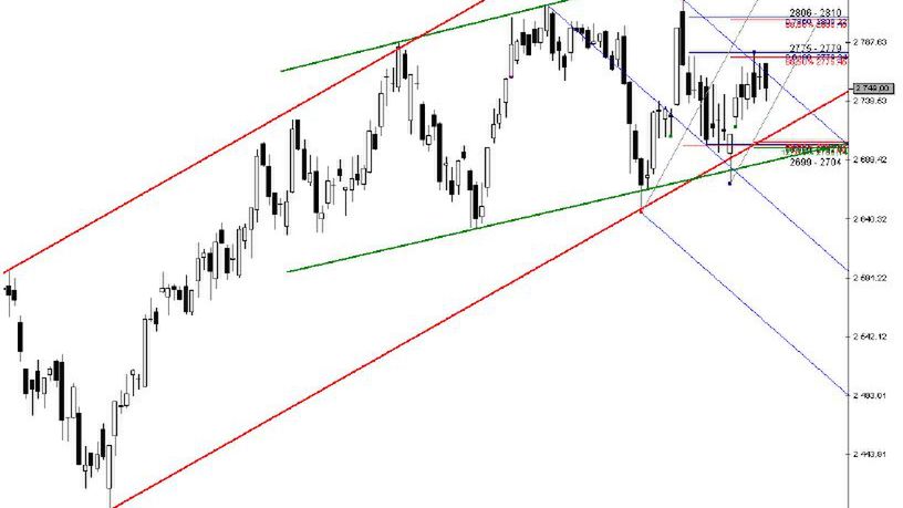 Niewątpliwie istotną rolę na wykresie kontraktów odgrywa ostatnio przedział oporu Fibonacciego: 2775 – 2779 pkt. Jak wiadomo w miniony piątek właśnie tutaj doszło do uformowania się lokalnego punktu zwrotnego.