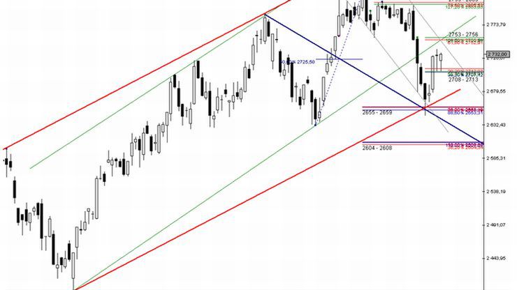 Jak wiadomo ubiegłotygodniowe przełamanie strefy: 2708 – 2713 pkt mogło już zostać potraktowane jako intradayowy sygnał kupna. Z moich analiz online pamiętamy jednak, że impet fali wzrostowej wyczerpał się w rejonie krótkoterminowej zapory podażowej: 2730 – 2733 pkt. Przebiegała tutaj także median line, zatem strefa odznaczała się nieco większym poziomem wiarygodności. Strona popytowa, po zanegowaniu 2708 – 2713 pkt nie potrafiła zatem zainicjować kolejnej podfali, która byłaby w stanie dotrzeć do okolic równorzędnej pod względem wiarygodności zapory podażowej Fibonacciego: 2753 – 2756 pkt.