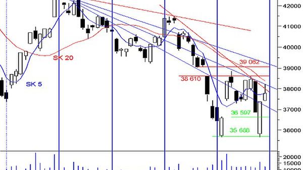 Wczorajsze rozpoczęcie notowań od luki hossy i wzrost po otwarciu wraz z przełamaniem oporu w postaci połowy poniedziałkowej czarnej świecy oraz pierwszej linii wachlarza Fibonacciego, dawało szansę stronie popytowej na kontynuowanie wzrostu do poziomu luki 38 610 – 39 062 pkt. Rzeczywistość niestety okazała się inna. Wzrost został powstrzymany dużo wcześniej, na środkowej linii wachlarza Fibonacciego w efekcie czego powstała świeca o długim górnym cieniu, mówiąca o próbie przejęcia kontroli nad rynkiem przez podaż. Mimo to indeks zanotował wzrost co przełożyło się na wskazania oscylatorów. STS wzrósł, generując sygnał kupna, podobnie MACD, RSI wciąż rośnie pond swoją linią trendu wzrostowego. Sama formacja świecowa nie ma silnie negatywnej wymowy, pozytywne sygnały płyną ze wskaźników, jednak duże znaczenie odgrywa wyżej wspomniana luka bessy oraz linie Fibonacciego, skutecznie powstrzymujące do tej pory kupujących. Dopiero przełamanie tych oporów będzie sugerować rzeczywiste nabieranie siły przez rynek a