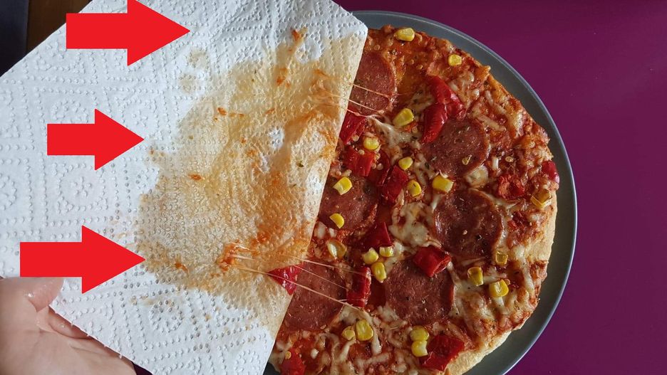 Wiadomo, że pizza to potężne źródło tłuszczu. Zaskakuje mnie jednak fakt, że jest go w tym produkcie aż tak dużo. Postanawiam taką pizzę kupić, upiec i odsączyć tłuszcz za pomocą ręczników papierowych. Chcę gołym okiem zobaczyć, ile go jest.