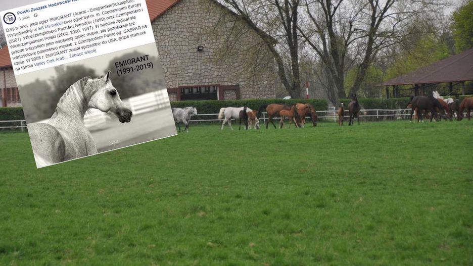 "Dziś w nocy padł ogier EMIGRANT (Ararat - Emigrantka/Eukaliptus). Wyhodowany w SK Michałów siwy ogier był m. in. Czempionem Europy (2001), Wiceczempionem Pucharu Narodów (1999) oraz Czempionem i Wiceczempionem Polski (2002, 2000, 1997). W hodowli zapisał się przede wszystkim jako wspaniały ojciec matek, ale pozostawili też wartościowe potomstwo męskie, z Czempionem Polski og. GASPAR na czele" – poinformował w mediach społecznościowych Polski Związek Hodowców Koni Arabskich (PZHKA).