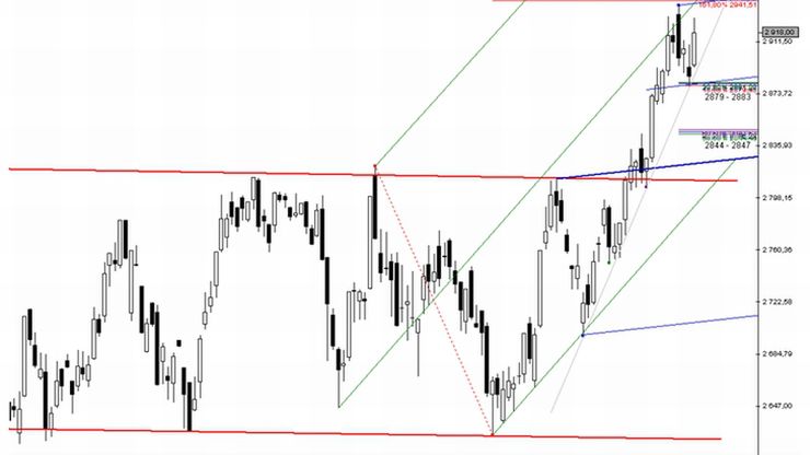 Jak wiadomo impet stosunkowo silnego ruchu korekcyjnego wyczerpał się dokładnie w rejonie zapory cenowej Fibonacciego: 2879 – 2883 pkt. Pomimo niesprzyjającej sytuacji zewnętrznej (mam tutaj na myśli końcową fazę wtorkowej sesji) stronie popytowej udało się wybronić w/w przedział wsparcia.